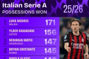 體育資訊4月3日訊 足球數(shù)據(jù)網(wǎng)站Squawka統(tǒng)計(jì)本賽季至今意甲球員奪回球權(quán)排行榜,40歲莫德里奇171次第一,馬蒂奇第三。