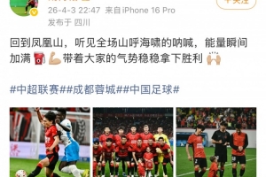賽后為蓉城首發(fā)踢滿全場的胡荷韜更新社媒慶祝勝利,他寫道: